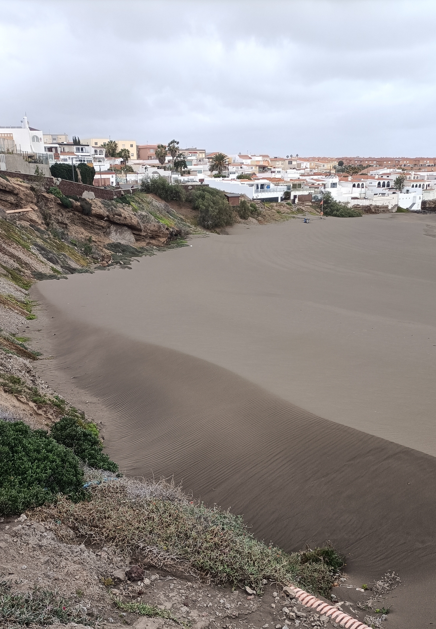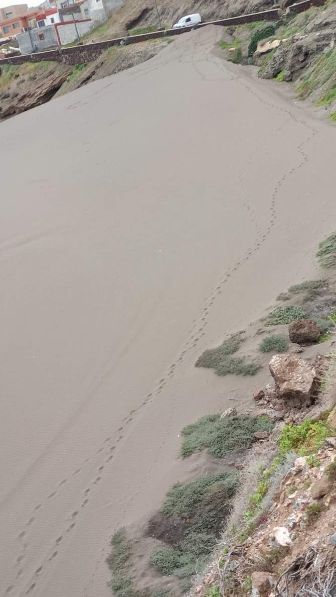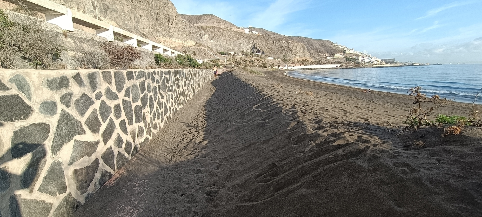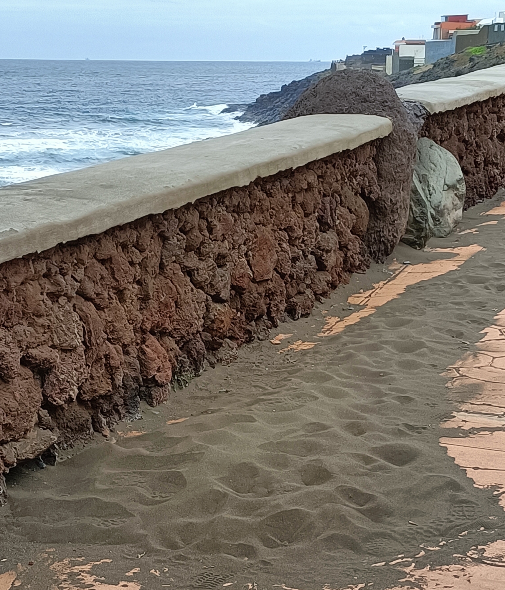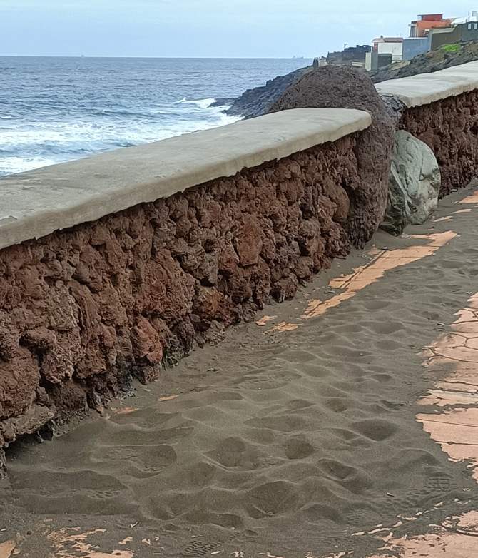 Recordé entonces como el Paseo Marítimo que bordea la playa de La Laja presenta la senda cubierta de arena en una buena parte de la misma. La arena de la playa lo ha invadido repetidas veces y ahora, abandonado su cuidado por dejación e inutilidad, eliminado el control sistemático de sus arenas, se amontona sobre el Paseo, amenazando con llegar a la GC-1.