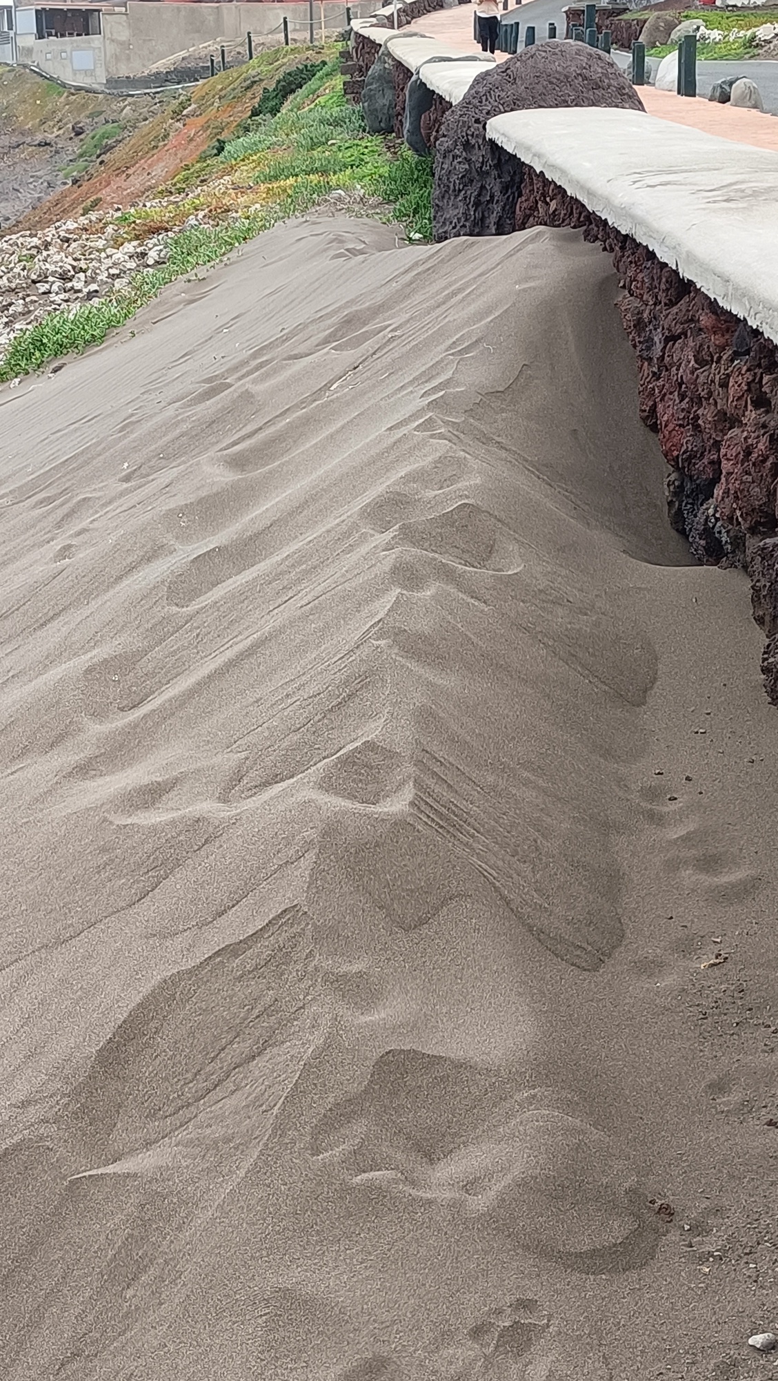 Ayer, al igual que muchas mañanas de este mes de abril, volví a transitar por el Paseo. La duna había alcanzado el muro y comenzaban sus arenas a desbordarlo. Sobre el paseo, arenas negras procedentes de aquella enorme masa arenosa, arrastradas por los fuertes vientos de las últimas borrascas comenzaban a cubrir las losetas del camino. No me extrañó ver a varios operarios de Limpieza barriendo el paseo y cargando y vaciando, de nuevo sobre la duna, los cubos de arena recogidos de la que invade el Paseo cada día, con la ayuda de los vientos reinantes.