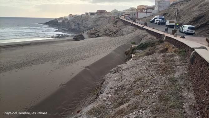 Así reflexionaba yo a mi paso por la playa del Hombre, no hace más de cinco años. Recuerdo que, como puede observarse en la serie de fotos adjuntas, le restaba a la duna entre cinco y ocho metros de distancia para alcanzar el muro del Paseo y un desnivel en altura cercano a los dos metros.
