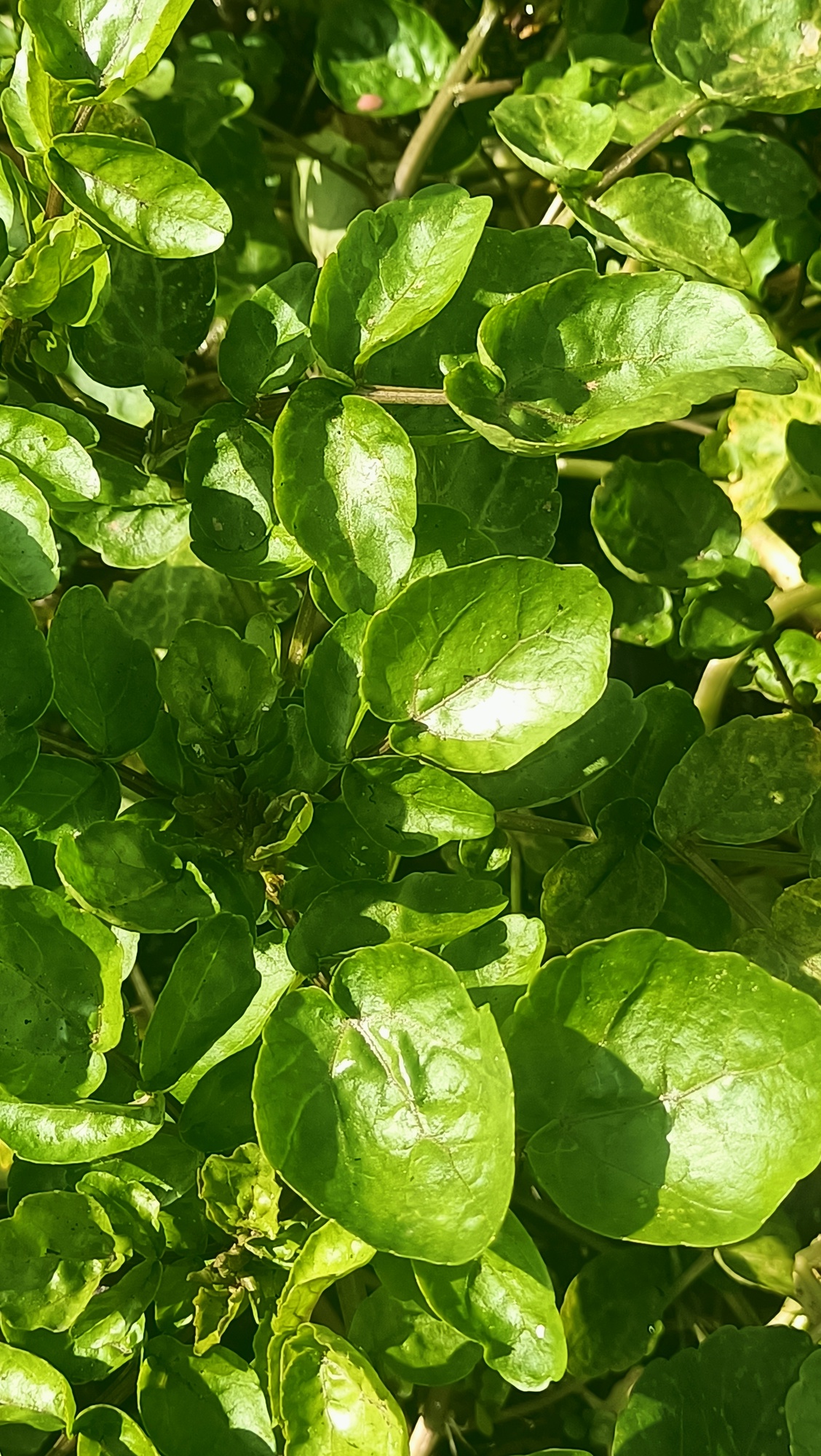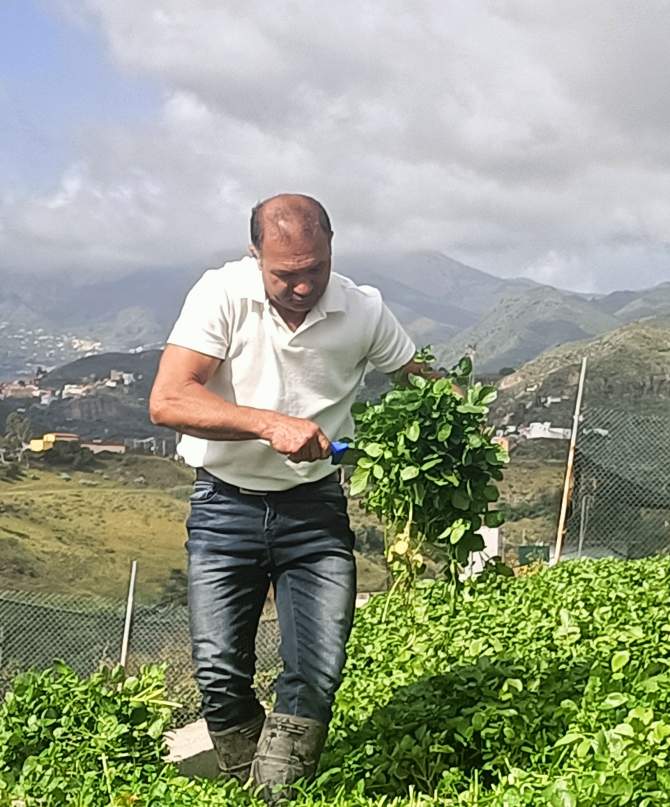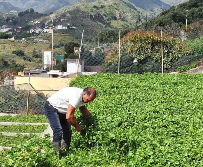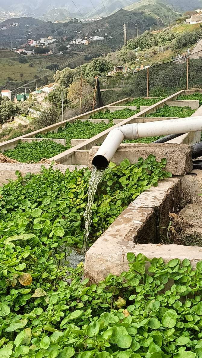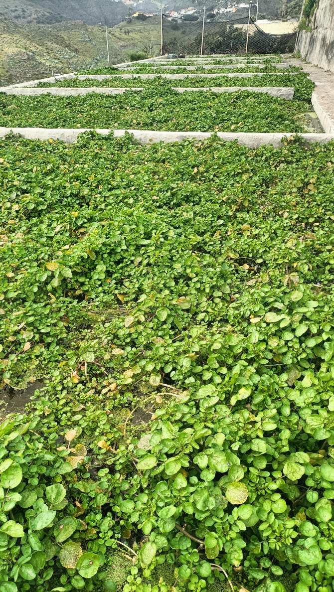 Cautiva el sonido constante del agua y sorprende ver tan preciado líquido fluyendo por los caños, favoreciendo la corriente de agua necesaria para que se asienten y crezcan los berros. Bajo los caños, la presencia de un helecho tan nuestro, tan habitual en las pilas canarias, el culantrillo. Satisface ver los diferentes estados de desarrollo de los berros, la frondosidad de los mismos, saber del momento óptimo para ser recolectados, de los tratamientos que llevan, del control del PH, del proceso de cultivo diferencial en verano y en invierno, pues las circunstancias cambian: cambia la disponibilidad y exigencia de agua, varían las horas de luz, fluctúan las temperaturas, cambian los tiempos de recolección del berro (unos treinta días más o menos en invierno, unos veinte en verano)… Tienen un verde más intenso los producidos en umbría, en la otra ladera del barranco. Allí los cultiva uno de los hermanos. La producción en esta finca alcanza los veinticinco mil kilos algunos meses, otros desciende un poco, podemos hablar entonces de unas doscientas cincuenta, trescientas toneledas de berros al año. Observo residuos orgánicos generados durante el cultivo de los berros, es materia muerta, tallos en su mayoría. Se dejan secar en origen y luego van para su compostaje, pues no son utilizados como forraje animal.
