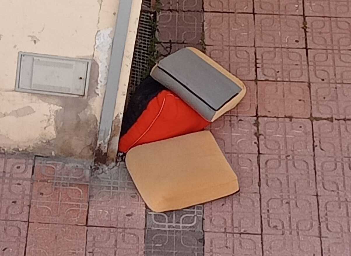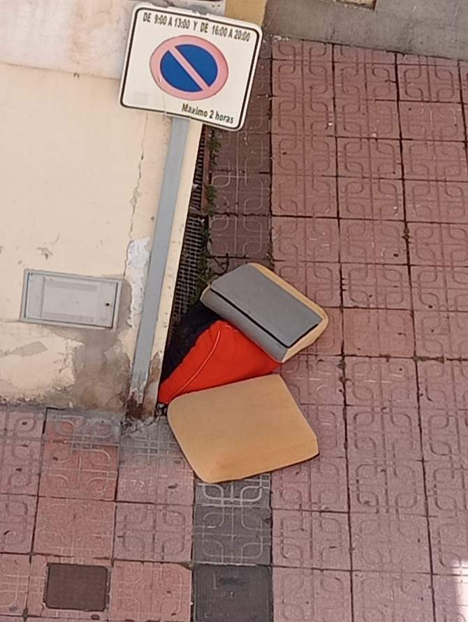 Según trasladan residentes de la zona, los objetos permanecieron en la acera desde hace varios días sin que fueran retirados, pese al paso habitual del servicio municipal de limpieza por este tramo del casco urbano.