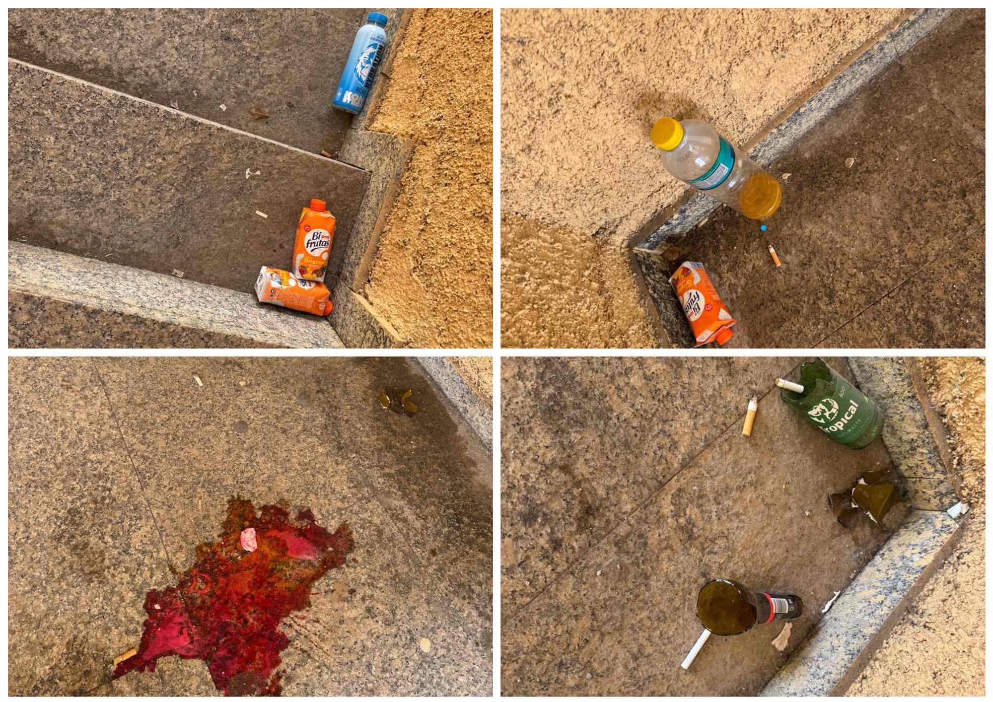 Las imágenes remitidas a este periódico muestran la presencia de envases de refrescos y bebidas energéticas, cartones de zumo, envoltorios de golosinas, colillas y botellas de vidrio rotas en distintos tramos de la escalera. También se aprecian manchas de líquidos derramados y suciedad incrustada en los peldaños, además de restos orgánicos y residuos acumulados junto a las paredes laterales.
