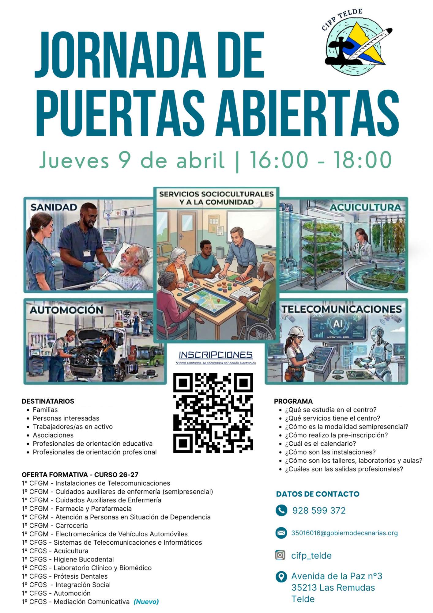 El Centro Integrado de Formación Profesional (CIFP) de Telde, antiguo IES Profesor Antonio Cabrera Pérez (Las Remudas), celebrará una jornada de puertas abiertas para dar a conocer su oferta formativa. Será este jueves, día 9 de abril, de 16.00 a 18.00 horas.