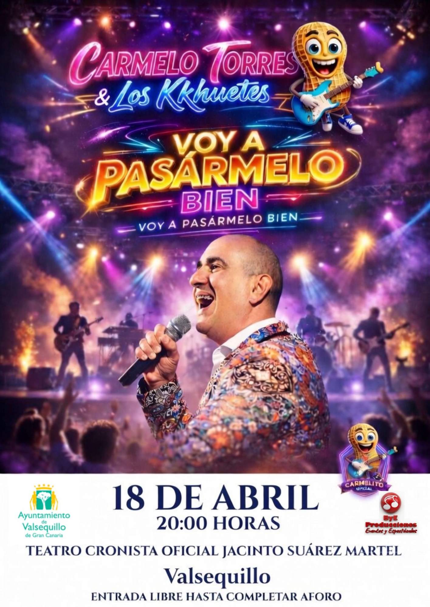 Bye Producciones, una empresa de Telde, ficha al cantante Carmelo Torres y presenta a su nueva banda, Los KKhuetes. El Teatro Cronista Oficial Jacinto Suárez Martel de Valsequillo acogerá el próximo 18 de abril, a partir de las 20.00 horas, la presentación oficial de la nueva apuesta musical de Bye Producciones: Los KKhuetes, una banda de versiones pensada para el disfrute del público de todas las edades.