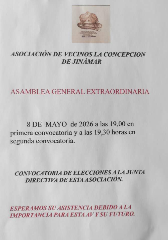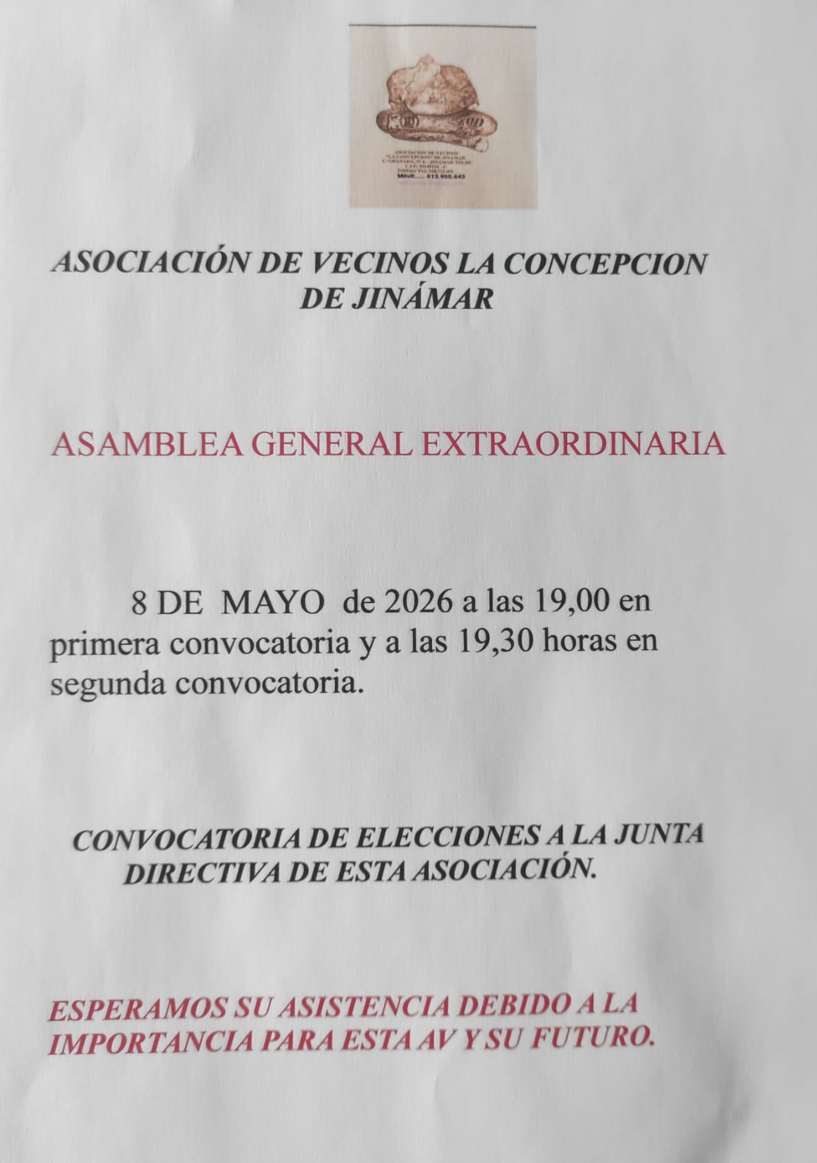 El próximo 25 de abril, el equipo de Tomás Santana Borrego concluirá su mandato al frente de la Asociación de Vecinos La Concepción de Jinámar. Han transcurrido cuatro años desde que su candidatura (la única presentada) contara con el apoyo de las personas asociadas. Ahora, tal y como establecen los estatutos, procede convocar una Asamblea General Extraordinaria para la elección de la junta electoral. Será el 8 de mayo, a las 19.00 horas, en primera convocatoria, y a las 19.30 horas en segunda convocatoria, en la sede de la calle Granada. A partir de esa fecha, se establecerá un plazo de 30 días para celebrar las elecciones.