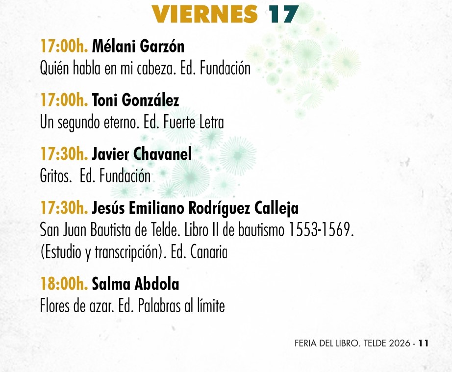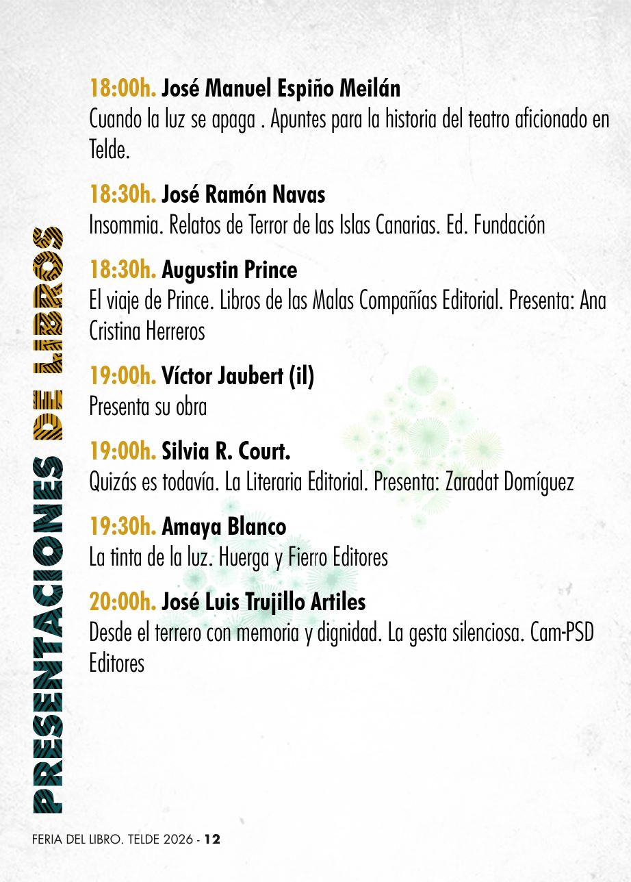 El programa incluye además múltiples presentaciones de libros, entre ellas las de Mélani Garzón, Toni González, Javier Chavanel, Jesús Emiliano Rodríguez Calleja, Salma Abdola, José Manuel Espino Meilán, José Ramón Navas, Agustín Prince, Víctor Jaubert, Silvia R. Court, Amaya Blanco y José Luis Trujillo Artiles, repartidas a lo largo de la tarde y la noche .
