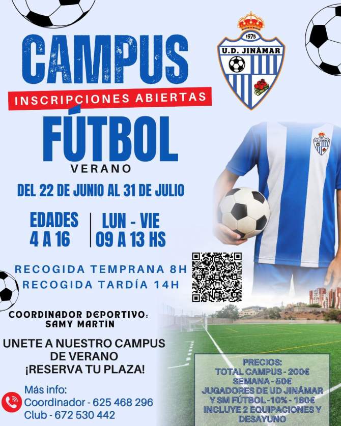 Cartel del campus veraniego del club jinamero (Foto: UD Jinámar)La Unión Deportiva Jinámar ha abierto las inscripciones para el campus de verano que celebrará del 22 de junio al 31 de julio en el estadio Pedro Miranda Rosales con la coordinación de Samy Martín, componente de la escuela canaria de entrenadores y con experiencia en el Unión Pedro Hidalgo, AD Huracán y CD Guiniguada Apolinario.