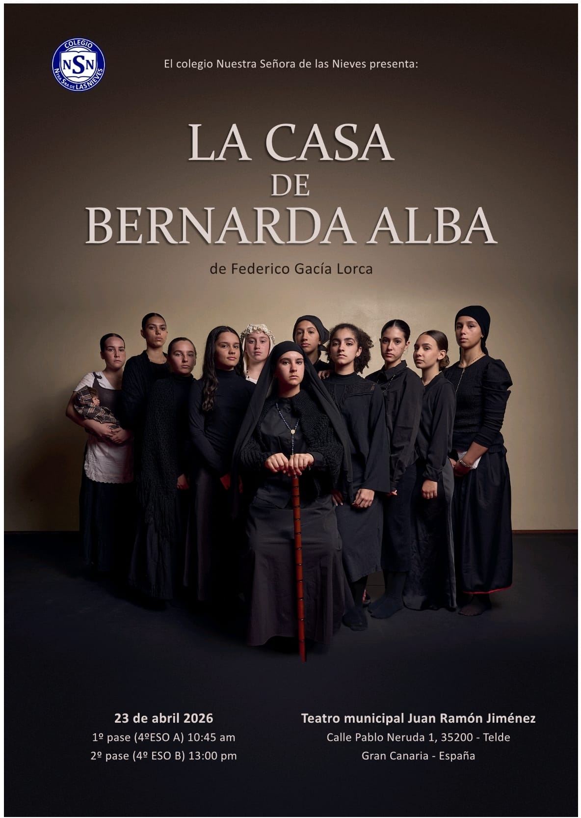 El Colegio Nuestra Señora de las Nieves llevará este juev es 23 de abril, a las 13.00 horas, al escenario del Teatro Municipal Juan Ramón Jiménez la representación de La casa de Bernarda Alba, la célebre obra teatral de Federico García Lorca.