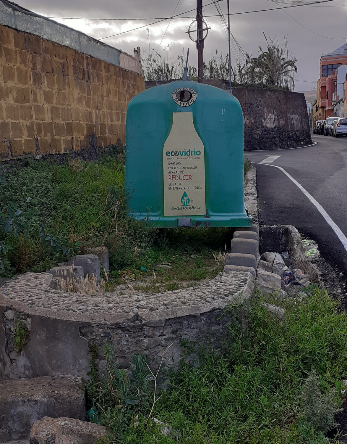 Imagen del contenedor de vidrio encima de la canalización (Fotos cedidas)Vecinos de la calle Alto de Los Leones (San Antonio) han denunciado la ubicación de un contenedor de vidrio sobre la cantonera La Portada tras los trabajos de asfaltado. Advierten de que el depósito fue colocado sobre un elemento que identifica como parte del patrimonio histórico-cultural del barrio.
