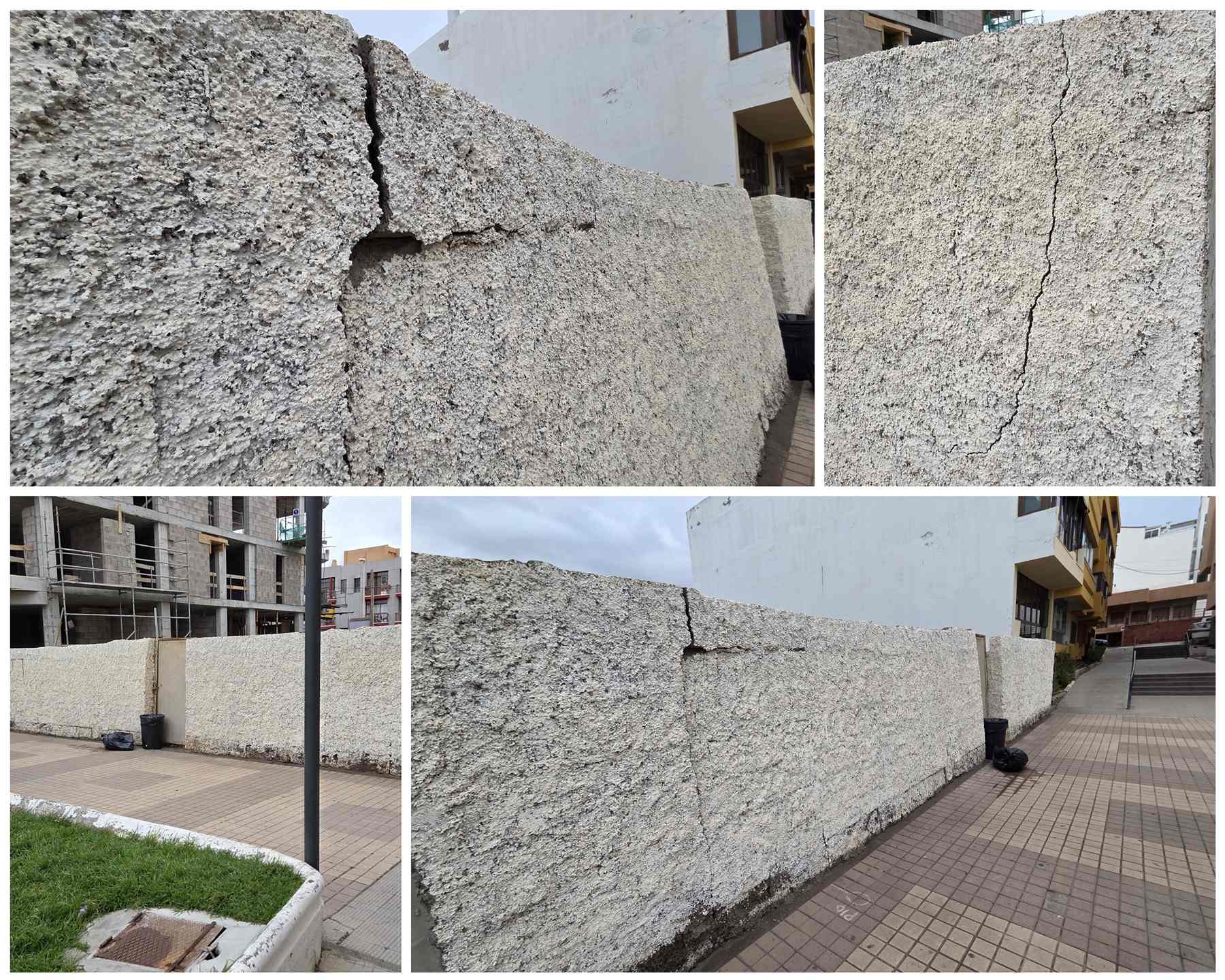 Vecinos del núcleo costero de Salinetas, en Telde, alertan del estado de un muro de bloques situado entre la calle Américo Vespucio y el paseo marítimo, que presenta grietas verticales de gran longitud y deformaciones visibles en su estructura, lo que, a su juicio, supone un riesgo evidente para la seguridad de los peatones que transitan diariamente por la zona.