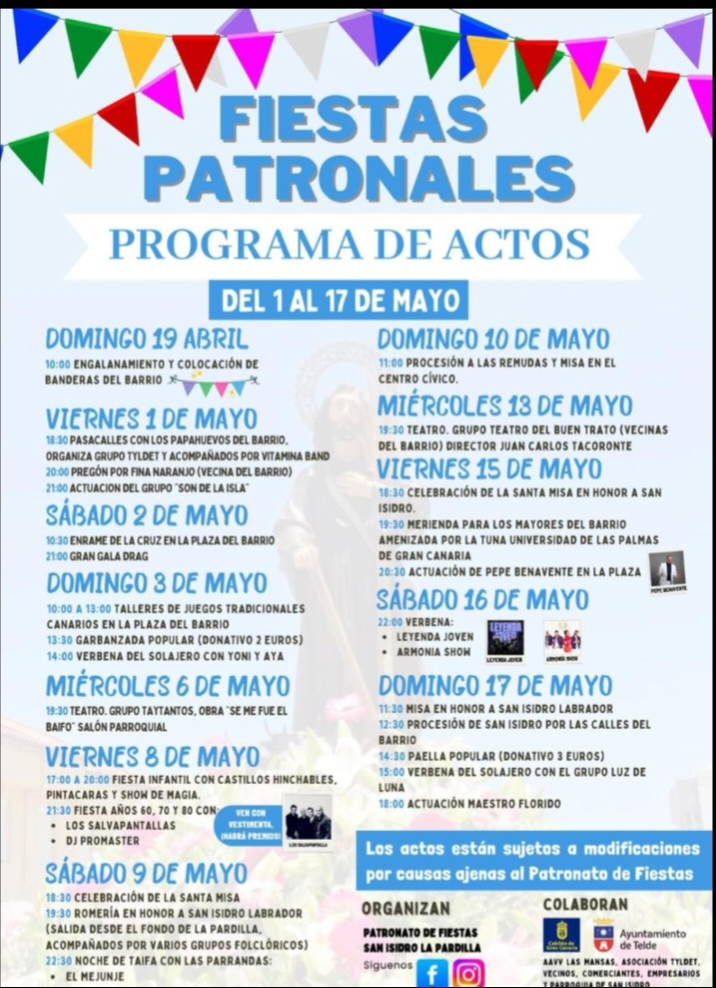 El programa incluye también la gala drag, el sábado 2 de mayo, así como talleres de juegos tradicionales canarios, una garbanzada popular y verbenas del solajero, reforzando el carácter participativo de unas fiestas con fuerte arraigo vecinal.