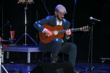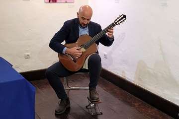 Se inicia la primera parte del recital con la extraordinaria y maestría musical del concertista de guitarra Gonzalo Macías que, el pasado mes de octubre participó con su colaboración en la Gala Solidaria Telde con La Palma en el Teatro Juan Ramón Jiménez. Para este encuentro con las letras y la música, nos presenta una bella selección de cuatro composiciones, sobre las cuerdas y acordes de su guitarra desarrolla un trabajo musical de arreglos y adaptación ciertamente fruto de una búsqueda y preciosa estructura de matices, ritmos y compases de una extremada sensibilidad y sentido artístico que “acordados” con los versos recitados, invitaron a la inspiración, sosiego a una total vivencia compartida por los aires de nuestras músicas isleñas. Interpreta como saludo y bienvenida la composición Puerto de La Luz.