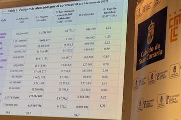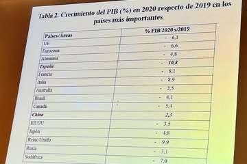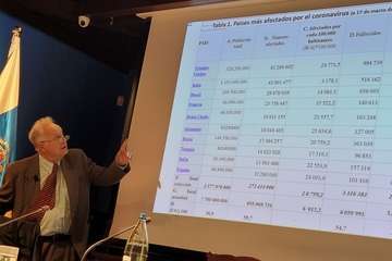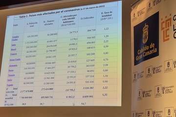 Después de presentar en proyección muestras estadísticas de los países más afectados por el coronavirus entre: Estados Unidos, India, Brasil, Francia, Reino Unido, Alemania, Rusia, Turquía, Italia, España en su población total de la selección 2.377.070.000 y el total de la Humanidad, 7.700.000.000, muestra el total de afectados por la evolución de la pandemia y afectados por cada 100.00 habitantes, fallecidos y tasa de letalidad, que da idea de la gravedad siendo una de las causas sanitarias de la crisis de este 2022 como bien se expone al inicio de la conferencia. Expuestas en otra tabla el crecimiento del PIB (%) en 2020 respecto a 2019 en los países más importantes, puntualizando el retroceso negativo de los países indicados, con la curiosa excepción de China, un 2,3% positivo. Causas económicas originadas por la crisis.