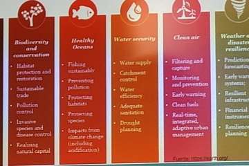Producción y consumo sostenibles (economía circular). Uso sostenible de la tierra. Ciudades y Casa inteligentes. IA y biodiversidad: Protección y restauración del hábitat. Comercio Sostenible. Control de la polución. Control de enfermedades y especies invasivas. Activar y potenciar el capital natural.