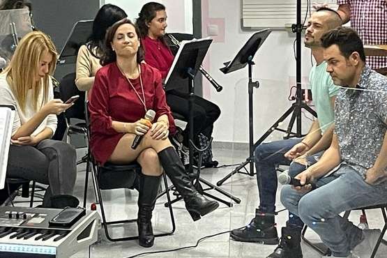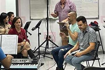 La Banda Municipal de Música y los cuatro solistas que este viernes ofrecerá en la plaza de Los Llanos el espectáculo Rebobinando celebraron esta tarde-noche un ensayo general de la actuación nada más aterrizar en la isla los cantantes procedentes de la Península.