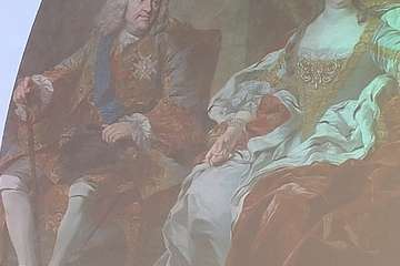 Isabel Farnesio segunda esposa de Felipe V con quien contrae matrimonio en 1714, nace en Parma en 1692 fallece en Aranjuez en 1766, hija de Eduardo II Farnesio, Príncipe heredero de Parma, y de la condesa palatina Dorotea Sofía de Neoburgo. De carácter y personalidad fuerte tan pronto se vio en España fue consciente de la tarea que como reina ella misma se encomendó y responsabilizó, en contra del melancólico y depresivo carácter del rey, sus acciones fueron decisivas para la política española del momento, y su preocupación por recuperar los territorios italianos perdidos por el Tratado de Utrecht. Tuvo con Fernando V siete hijos, consiguiendo para su hijo Carlos III futuro rey de España los reinos de Nápoles y Sicilia, al morir sin descendencia Fernando VI.