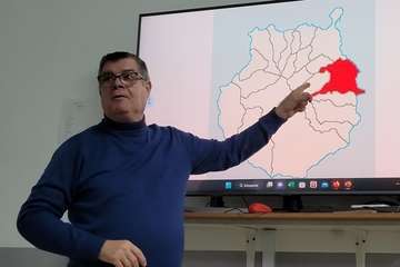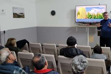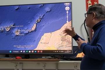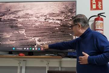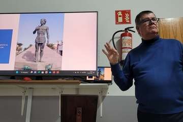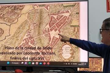Antonio González en su intervención con proyección de imágenes, expone un amplio y documentado recorrido histórico, geográfico, etnográfico y patrimonial de los orígenes y entornos de la primigenia Telde desde los albores de los primeros visitantes conocedores de su situación en el Atlántico próximo a la costa africana, romanos, fenicios, griegos, denominándolas como Islas Purpúreas, de las Hespérides, comentarios de Plinio, geógrafo.
