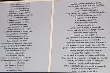 San Antonio de Padua, nacido en Lisboa, llamado primero Fernando y cuando se hace fraile franciscano cambia su nombre por el de Antonio. Se da lectura a un antiguo romance testimonio de sus milagros dedicado al santo. Con la compra de tierras con dineros propios traídos fruto del esfuerzo de la emigración comienzan los cambios en la sociedad de San Antonio, creando tiendas, generando oficios artesanos, y en los últimos tiempos la revolución urbanística entorno a los nuevos núcleos de viviendas que han desvirtuado un poco lo que antaño fue un barrio familiar.