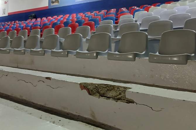 Las filas inferiores de la parte norte de la grada presentan zonas de hormigón desprendido y algunas sillas sufren roturas
