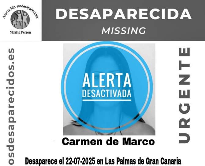 La Asociación SOS Desaparecidos ha desactivado este jueves la alerta por la desaparición de Carmen de Marco, la joven de 28 años cuyo paradero [...] Leer más...