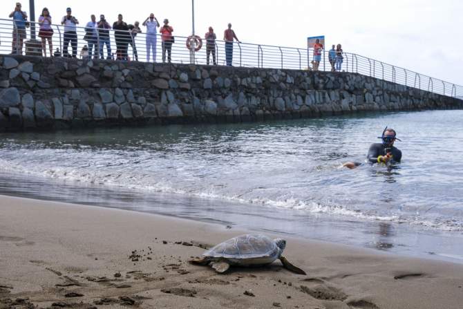 La tortuga verde fue hallada con hipotermia y heridas graves y viajó en avión hasta Gran Canaria para recuperar su libertad en aguas cálidas