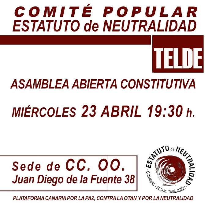 Este miércoles 23 de abril, a las 19.30 horas, se celebrará en Telde la asamblea abierta constitutiva del Comité Popular por el Estatuto de [...] Leer más...