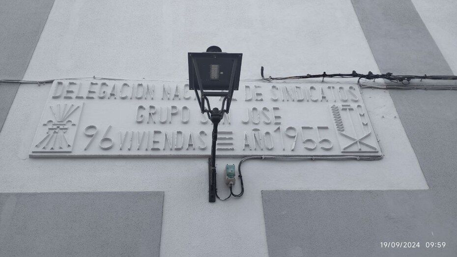 Entre los emblemas que aún permanecen en las fachadas de estas viviendas destacan el yugo y las flechas, símbolos asociados al régimen dictatorial
