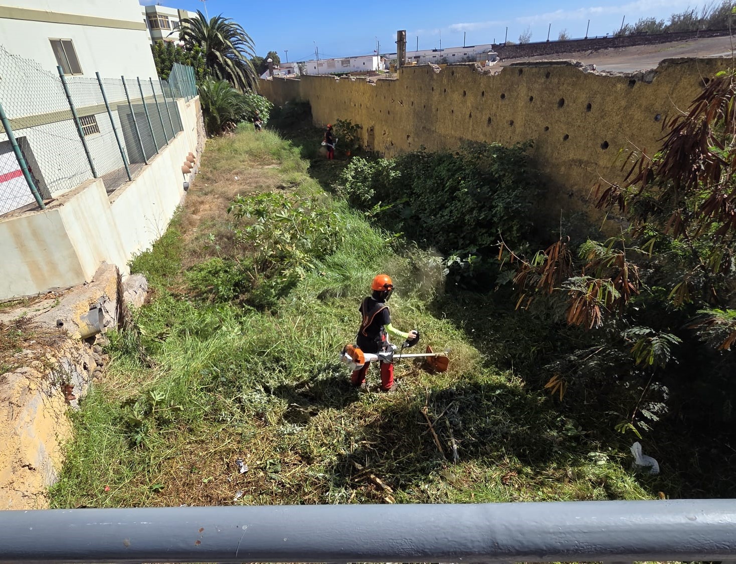 Operarios de la Unidad de Fuegos Forestales retiran maleza en los cauces para evitar desbordamientos como los registrados en marzo en la costa de Telde