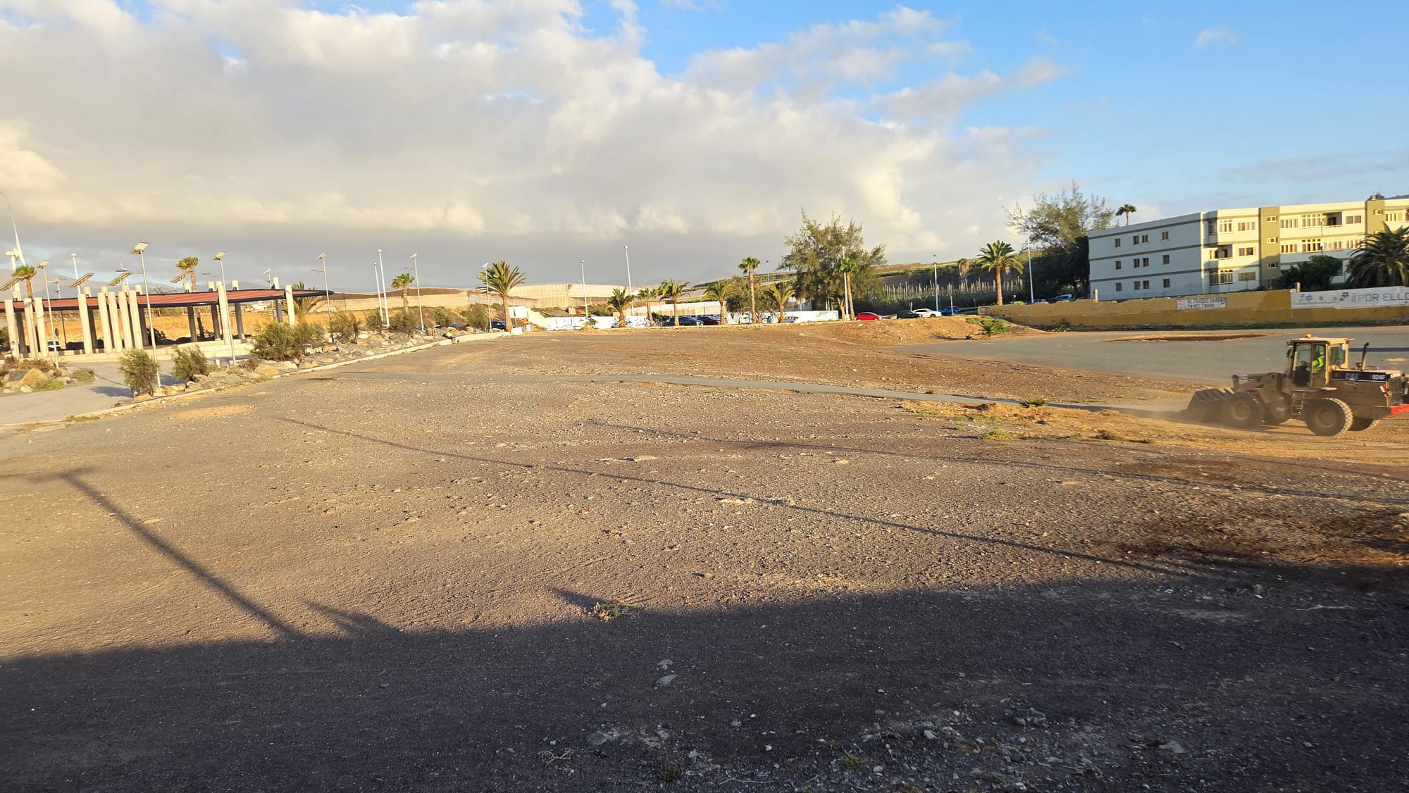 Un tractor acondiciona el terreno junto al parque urbano para acoger cientos de vehículos este sábado